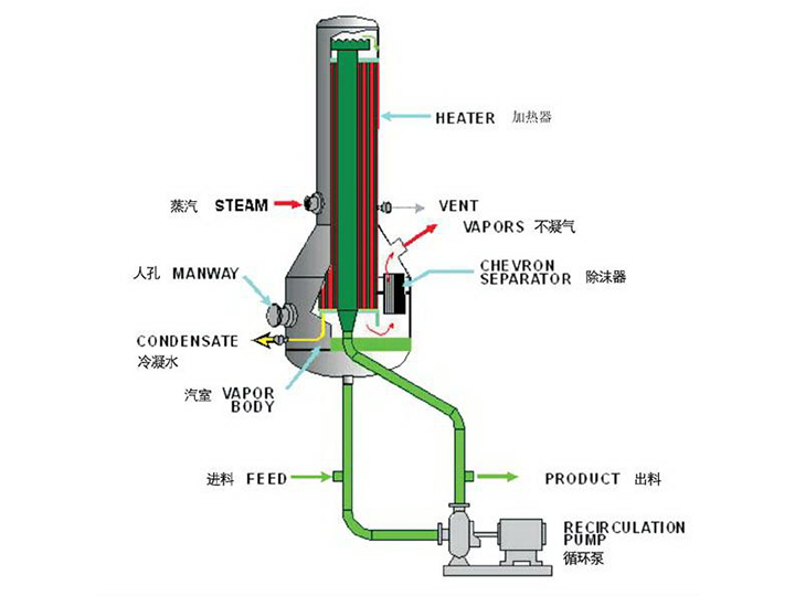 需濃縮的料液由泵送入加熱管頂部,沿著加熱管內(nèi)壁形成液膜向下流動。在這個過程中,由于管外的加熱,管內(nèi)液膜開始沸騰并部分蒸發(fā)。在列管下部分及其下游的分離器中,剩余的液體和蒸汽得以分離。